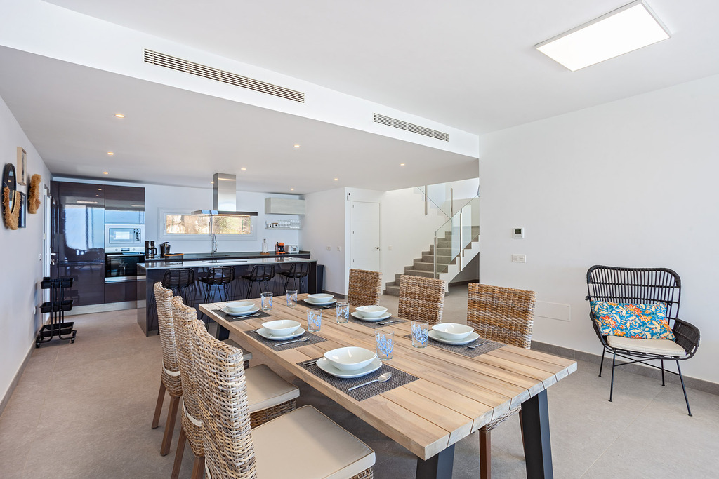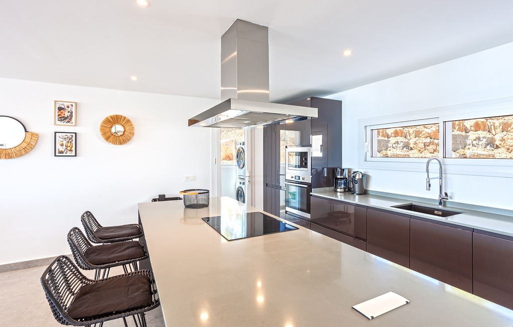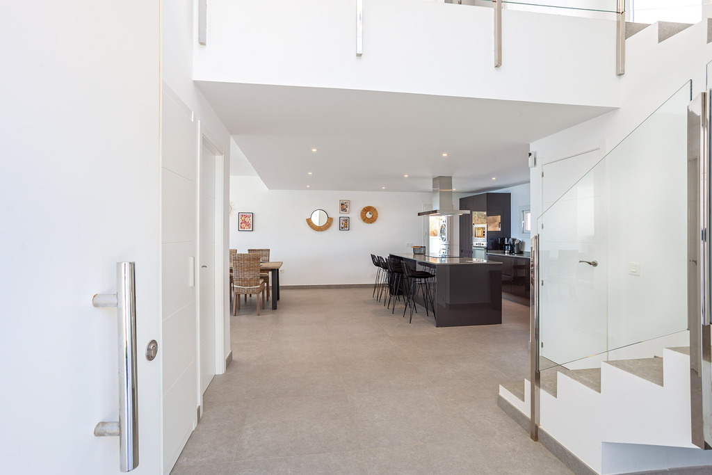 Im Erdgeschoss findest du den grosszügigen Eingang, ein Schlafzimmer mit Toilette/Dusche, eine Gäste-Toilette, einen schönen offenen Küchenbereich mit vollausgestatteter Küche, das gemütliche Wohnzimmer mit Zugang zu einer teilweise überdachten Terrasse mit Blick auf den Infinity-Pool und ein Solarium.